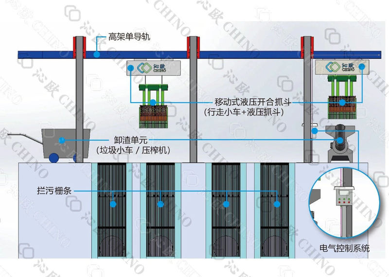*图为 沁欧®粗格栅系统 移动式抓斗(行走小车+液压抓斗)